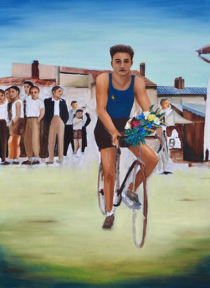 Dans le même registre que celui reproduisant le cycliste vainqueur d’une course locale (que l’on peut admirer plus bas sur cette même page), cette peinture rappelle sans équivoque que Anne a l’art de faire renaître sur la toile des scènes sans aucun doute plus rares aujourd’hui… des souvenirs parfois lointains.