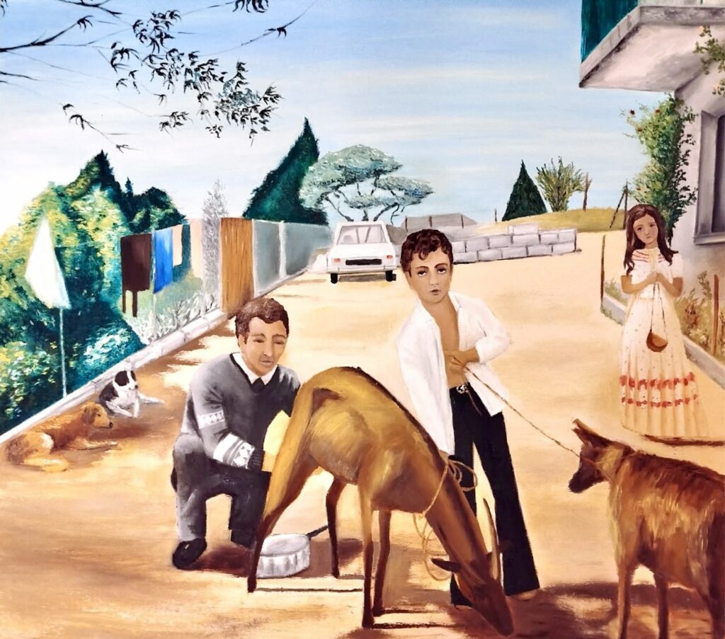Ce dernier tableau représente donc une scène un peu décalée par rapport à nos jours. La coupe « Pattes d’eph » du pantalon du jeune homme et la voiture garée au fond de la cour nous ramènent dans années 80, peut-être à leur début.