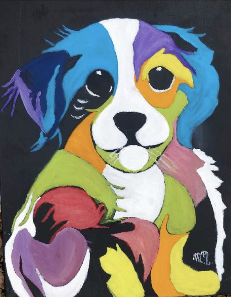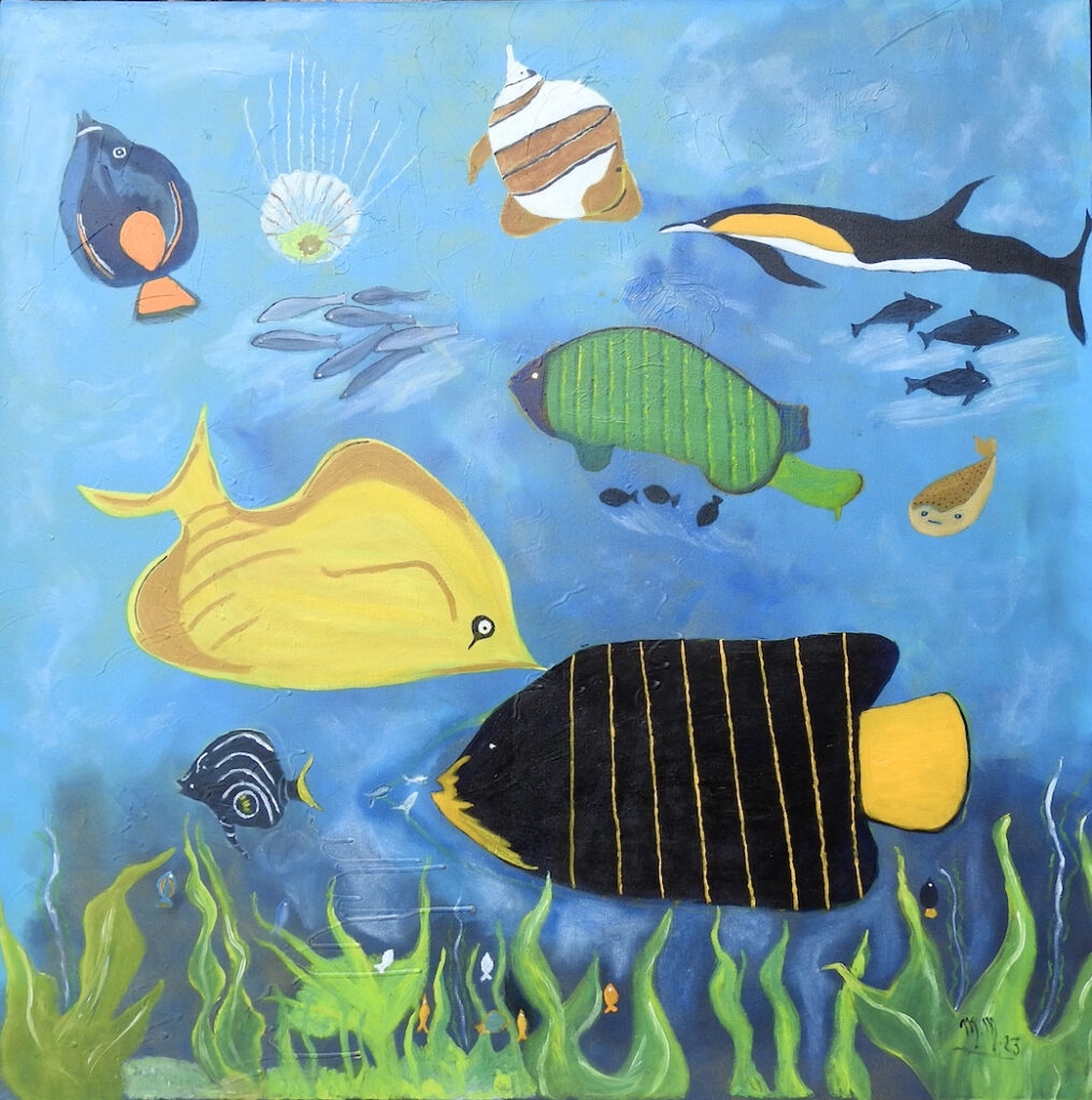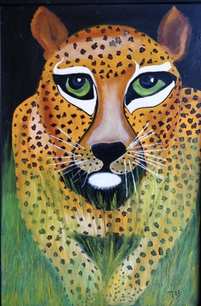 Parmi les tableaux peints par Martine depuis près d’une année, on remarquera cette série de peintures animalières dans le style Pop’Art avec, très souvent , une tendance à l’exotisme comme le suppose un léopard ou des poissons de lagon…