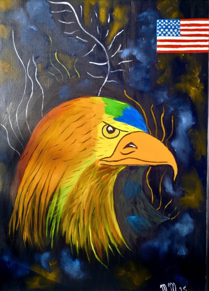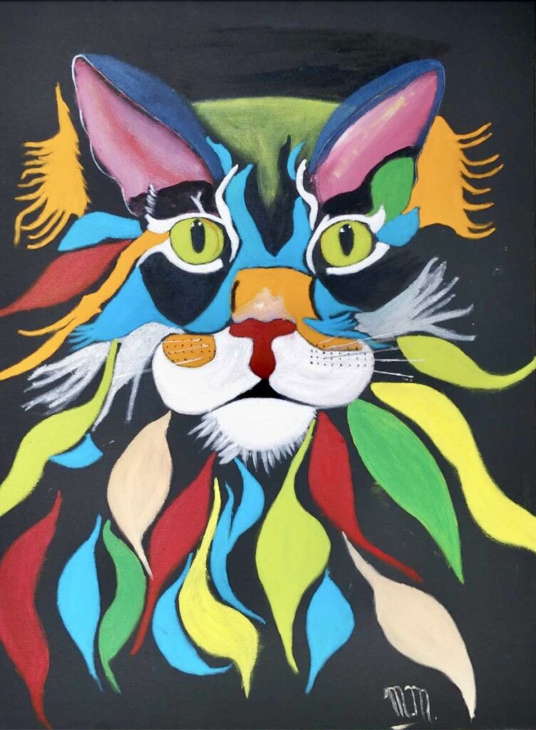 Depuis la fin de 2022, après quelques oeuvres rappelant l’Art Africain (que vous pouvez voir ou revoir ci-dessous), ses derniers tableaux oscillent entre Pop Art et Cubisme.